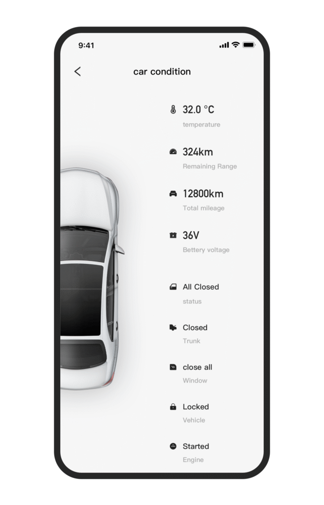 Press the vehicle status button to enter the page shown in the following figure to view the vehicle information, including remaining fuel, total mileage, battery level, door status, trunk status, window status, door lock status, engine status, etc.