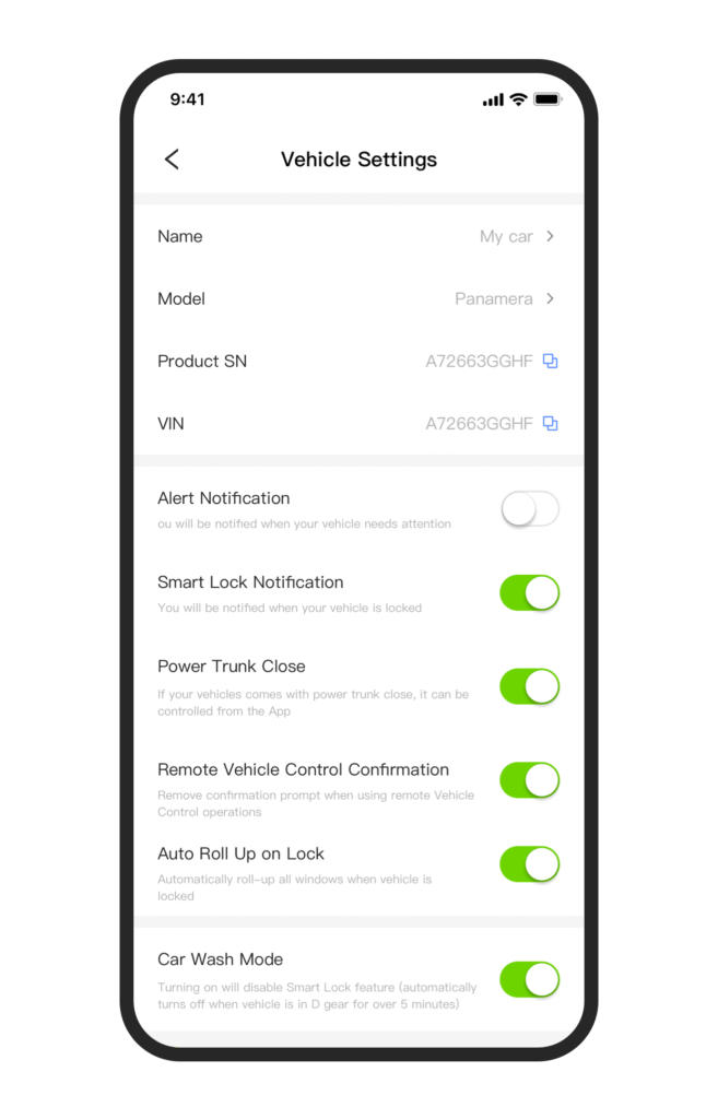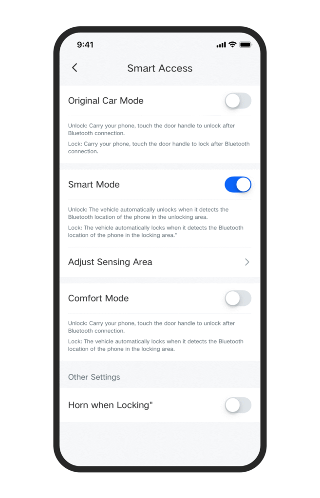 Smart Access is a keyless feature that allows you to automatically unlock when approaching the vehicle and lock when walking away from it, without taking out your smartphone. This feature is implemented by determining the strength of the Bluetooth signal. The App will notify you whether the lock/unlock is successful or not. This feature is disabled by default. You may enable it manually in Vehicle Settings.